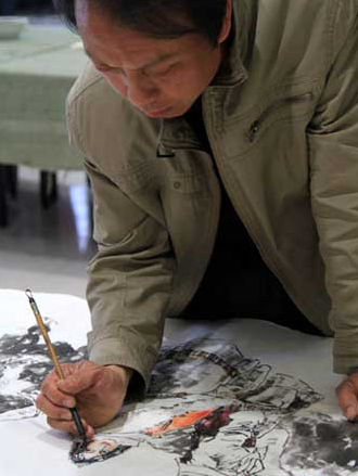 画家毛志成在现场精心勾染作品